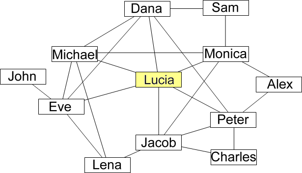 (図の中の線は,2人の間に友人関係があることを示しています. 例えば,Monica は Lucia の友だちですが,Alex は Lucia の友だちではありません.)