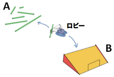 手順3. ロビーはAで選んだ棒をBに運び、坂に置きます。棒は坂を転がって下ります。