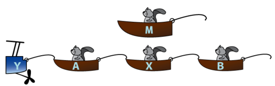 - やりかた2: ボートXのフックをBからはずす。次にボートAのフックをXからはずしてBにつなぐ。最後にボートMのフックをXにつなぐ。