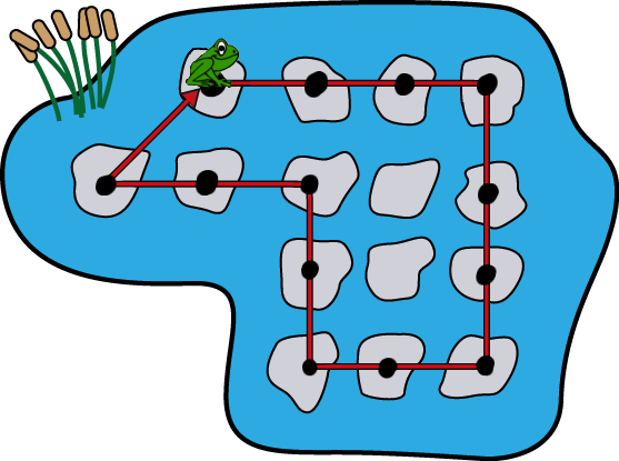 カエルが葉っぱの上を飛びながら池を一周しようとしています。 図のように、池には葉っぱが並んでいて、カエルは線の順番でジャンプしていきます。 図の黒丸は、カエルが着地した場所です。