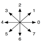 ジャンプする向きを、次の図のような8方向で表すとき、カエルのジャンプはどのような順番になりますか。